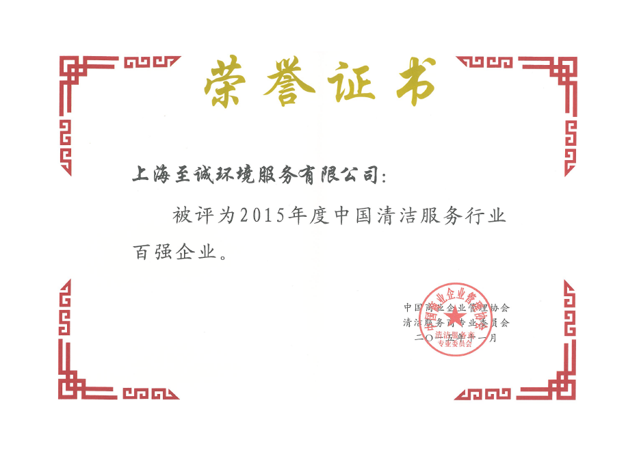 Five-Star Enterprise of Integrity | Top 100 Enterprises in Cleaning Service Industry in China